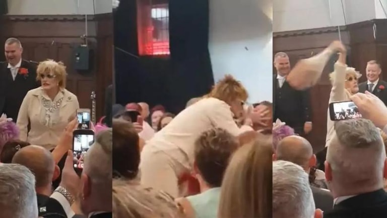 Cherie, who is performed by drag artist Mark Swift, has the stunned crowed stitches, kissing one of the guests and even hitting one of the grooms with her handbag.
