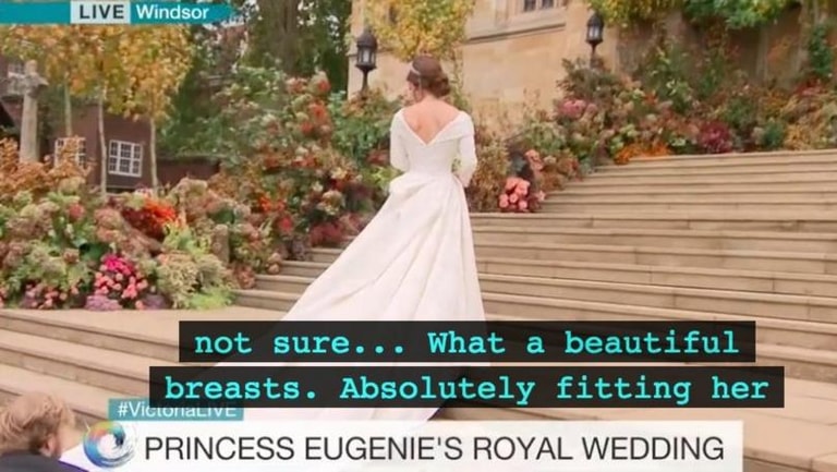 When a reporter remarked on Eugenie's "beautiful dress", the subtitles that appeared on screen did not match. Instead, the words "beautiful breasts" appeared on screen.