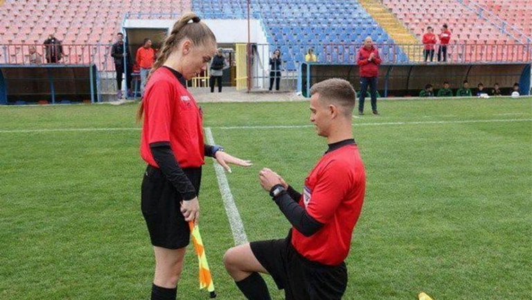 شهدت إحدى مباريات الدوري الروماني للدرجة الرابعة بكرة القدم، لقطة طريفة عندما قام الحكم المساعد بطلب يد زميلته في التحكيم للزواج، أمام اللاعبين والجمهور.