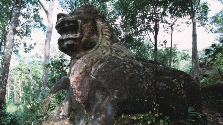 Mahendraparvata was one of the first capitals in the Khmer Empire, which lasted from the 9th to 15th centuries AD, but much of what we know come from inscriptions recovered from other sites. Scientists theorized that the city was located on the Phnom Kulen plateau, about 48 kilometers (about 30 miles) north of Siem Reap, but it was difficult to find evidence. The plateau was remote, inaccessible, covered with vegetation, and potentially home to landmines installed by the Khmer Rouge regime in the 1970s.