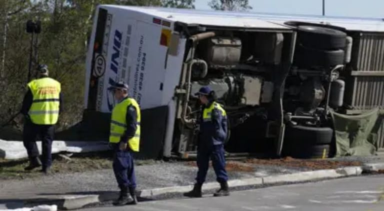 Television coverage showed the light-coloured coach lying on its side after the accident, with a dozen emergency workers wearing high-visibility yellow vests working nearby.