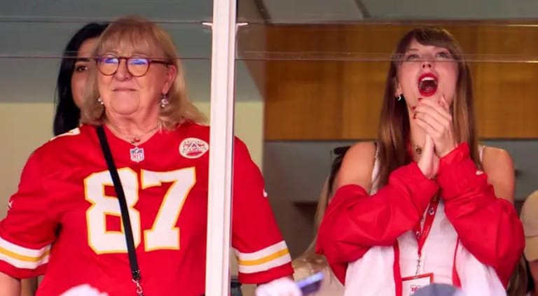 The singer was shown cheering on the Chiefs during the FOX Sports broadcast, dressed in a red and white team jacket. She appeared to be sitting next to Donna Kelce, the player’s mom, chatting and laughing throughout the game at Arrowhead Stadium in Kansas City.