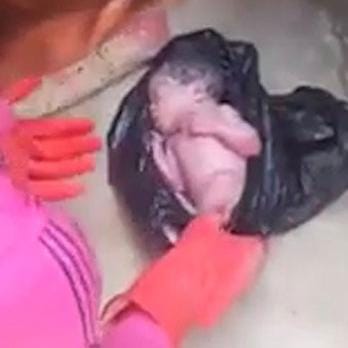 The group prepare to take the child out of the bag and in the video, one woman puts on a pair of plastic gloves to take the infant out of the bag.