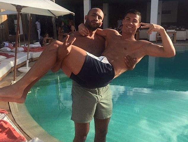 Another shows Ronaldo being held by Hari, who captioned it: 'Just married hahahaha. Always there to pick you up bro.'