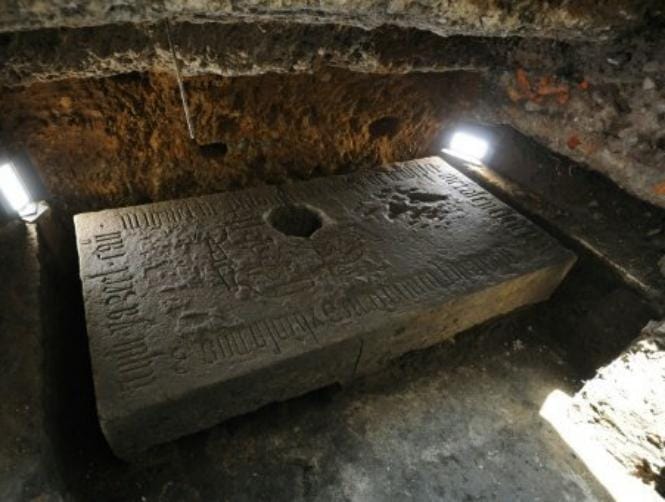 The engineers found the stone in recent days after digging eight inches deeper than planned when placing one of eight lampposts that will illuminate the current cathedral.