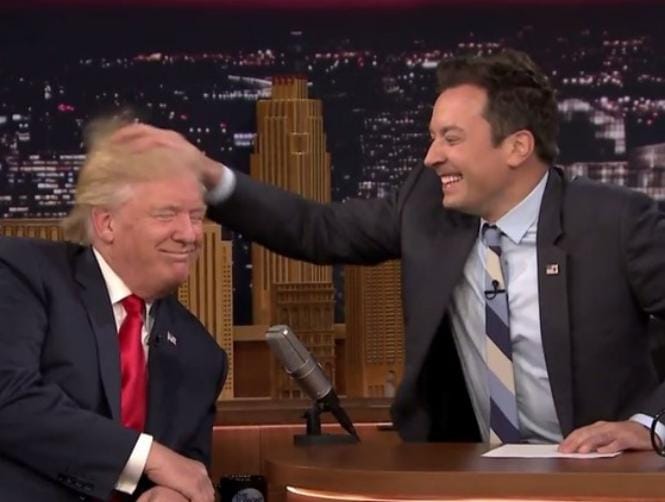 مازح مقدّم برامج التلفزيون الأميركي المعروف جيمي فالون مرشّح الحزب الجمهوري للانتخابات الرئاسية الأميركية دونالد ترامب ببعثرة تسريحة شعر رأس الملياردير الجمهوري.