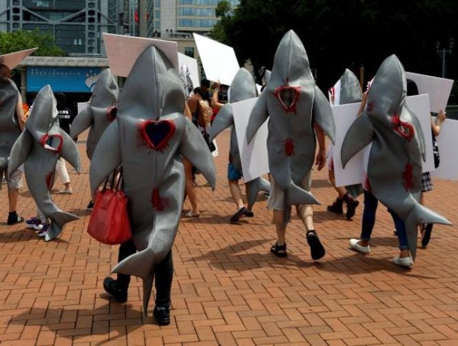 Protesters wearing shark costumes with the fins cut off surrounded a famous restaurant beside the Hong Kong harbor on Saturday, to demand it halt sales of shark fins, especially from threatened species, such as the whale shark.