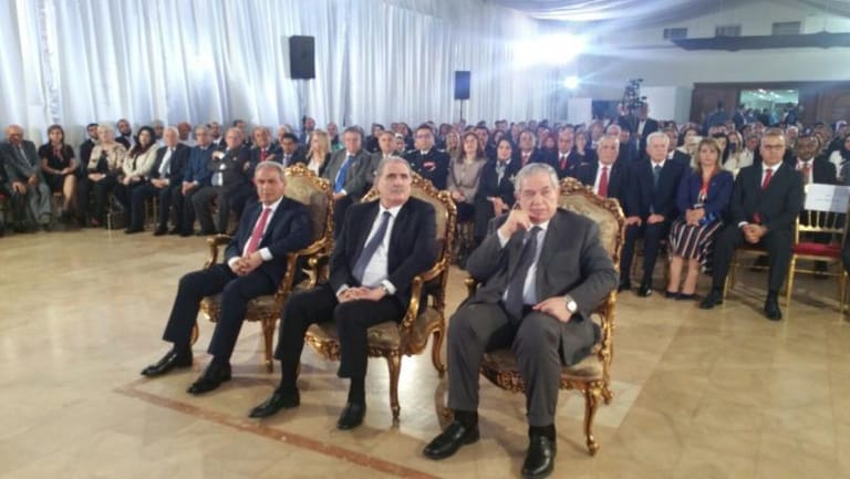وألقى ممثل رئيس الجمهورية كلمة أشار فيها إلى أن "القدس هوية وقضية وعاصمة أبدية لفلسطين"، وقال: "الحضور الكريم، كلفني فشرفني فخامة رئيس الجمهورية العماد ميشال عون بتمثيله في حفل افتتاح أعمال المكتب الدائم لإتحاد المحامين العرب في الفيحاء، كيف لا؟ والقدس تسكن في حنايا قلب هذا القائد المشرقي الهوى والعربي الانتماء واللبناني الهوية. أنقل تحية فخامة الرئيس إليكم جميعا، كيف لا؟ ومثل هذه التحية تصدر من القلب الكبير إلى المحامين العرب، وهم حملة مشاعل الحرية والكرامة الإنسانية في بلدانهم. هل يذكر أحد منا في التاريخ أن انتقلت عاصمة من دولة إلى أخرى، حتى في زمن الإمبراطوريات البائدة؟ سقط جدار برلين، وتوحدت المانيا، واستقرت عاصمتها في المدينة المستعادة بعد سقوط الجدار، والقدس لا تزال تنزف دما من على صليب جلجلتها، والعالم يشيح النظر عن افظع جريمة في حق الإنسانية جمعاء باستباحة شعب وأرض وعاصمة لعقود وإقامة دولة شعب الله المختار زيفا على أرض عربية غالية غابت عن الهم العربي، أو جله، مركزيا وتفصيليا، كأن فلسطين مجرد ذكرى عابرة في تاريخ الأمم والشعوب".