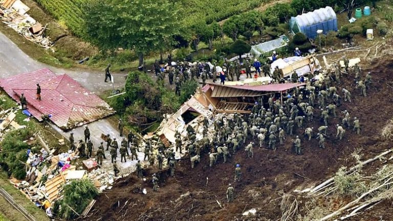 Soldiers in fatigues and orange-clad rescue workers searched for survivors, picking through debris on huge mounds of earth near the epicenter in Atsuma in southern Hokkaido. Aerial footage showed rescuers with dogs walking through the destruction.